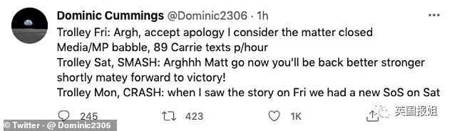 而鮑裡斯的老仇傢,前政治參謀卡明斯更是爆瞭猛料。他說鮑裡斯忽然轉變主張,是由於他過度幹政的老婆卡莉:“每小時給他發瞭89條短信,催他辭退漢考克。”